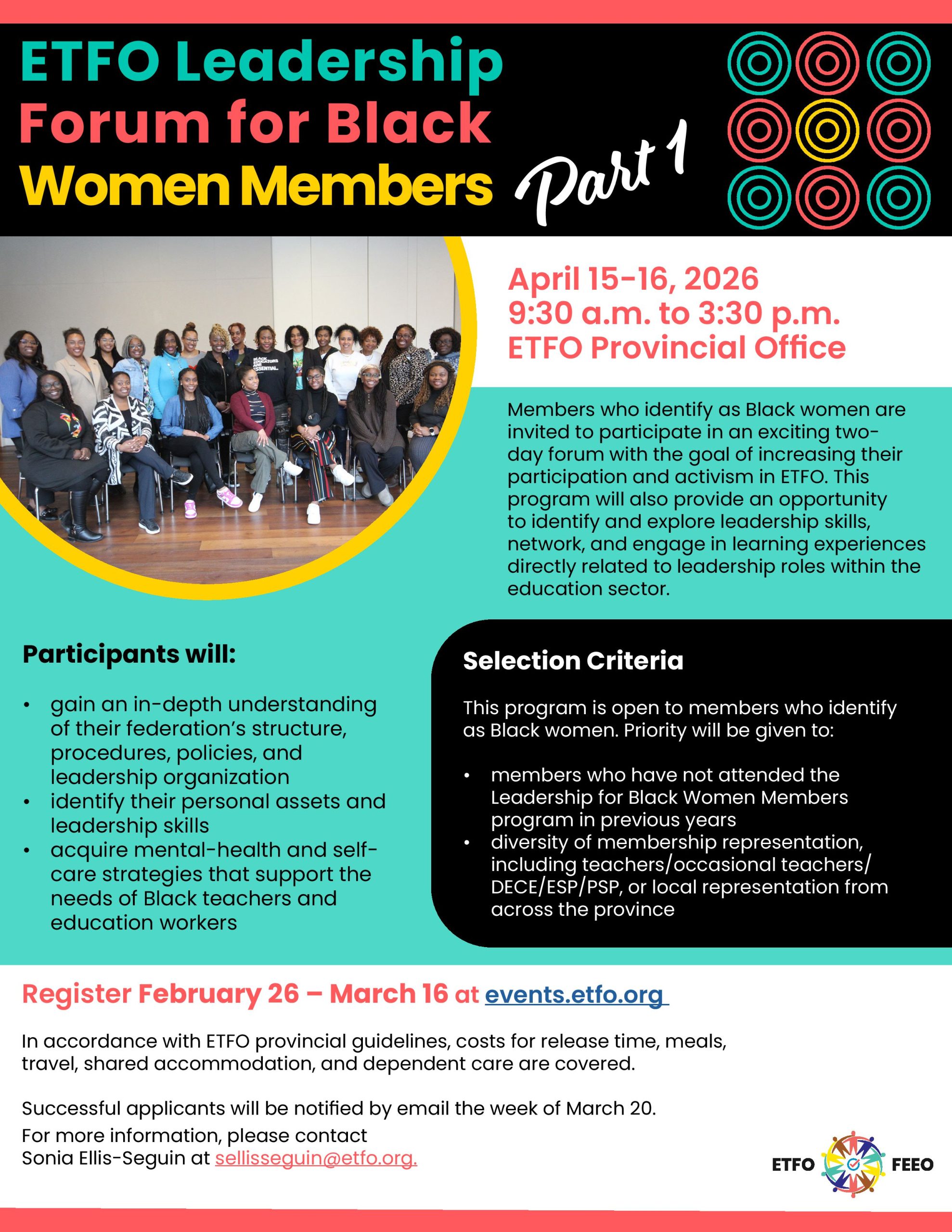 « All Events Leadership Forum for Black Woman Members April 15 @ 9:30 am - April 16 @ 3:30 pm « Anti-Oppressive Framework Program – Thunder Bay PA Day » LEARN MORE AND REGISTER Add to calendar Google Calendar iCalendar Outlook 365 Outlook Live Details Start: April 15 @ 9:30 am End: April 16 @ 3:30 pm Event Category: ETFO Conference Website: https://members.etfo.ca/programs/professional-learning/courses/leadershipforumblackwomanmembers Organizer ETFO Provincial Office Phone 1-888-838-3836 View Organizer Website Venue ETFO Provincial Office 136 Isabella Street Toronto, ON M4Y 0B5 Canada + Google Map Phone 1-888-838-3836 View Venue Website