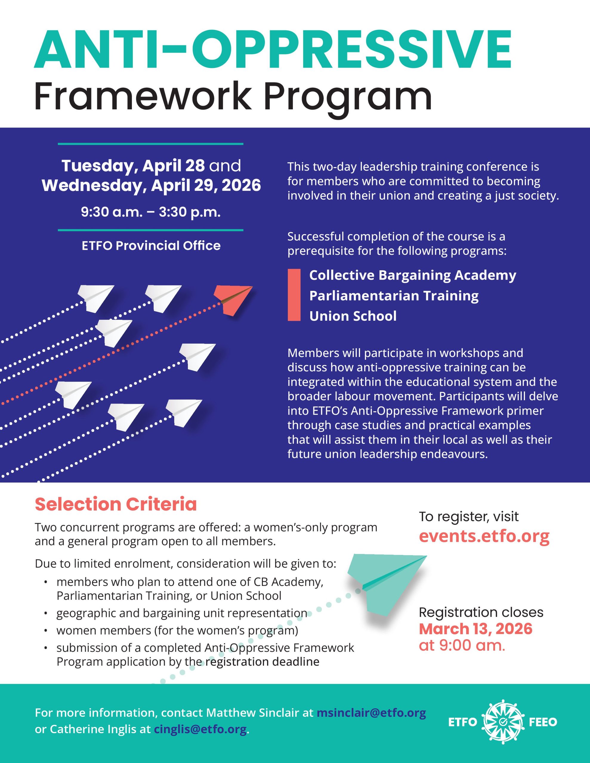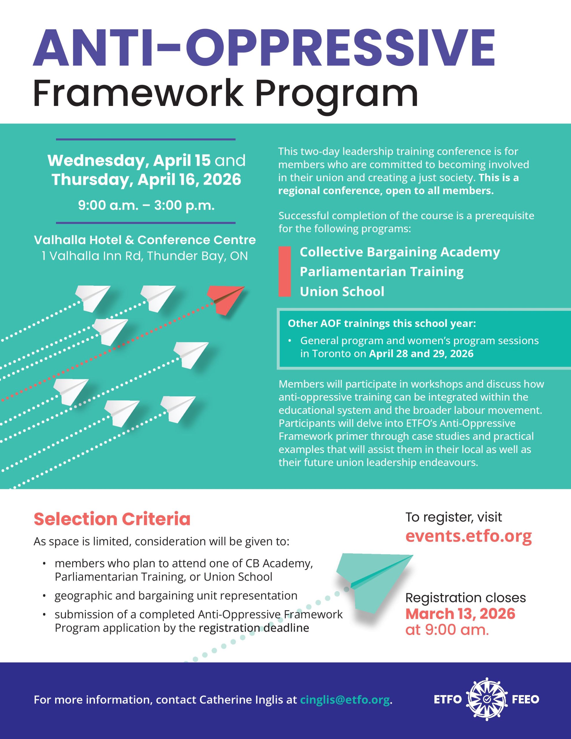 ETFO Provincial Office 136 Isabella Street, Toronto, ON, CanadaThis two-day leadership training conference in Toronto is for members who are committed to becoming involved in their union and creating a just society. Register by March 13 at 9:00 a.m.