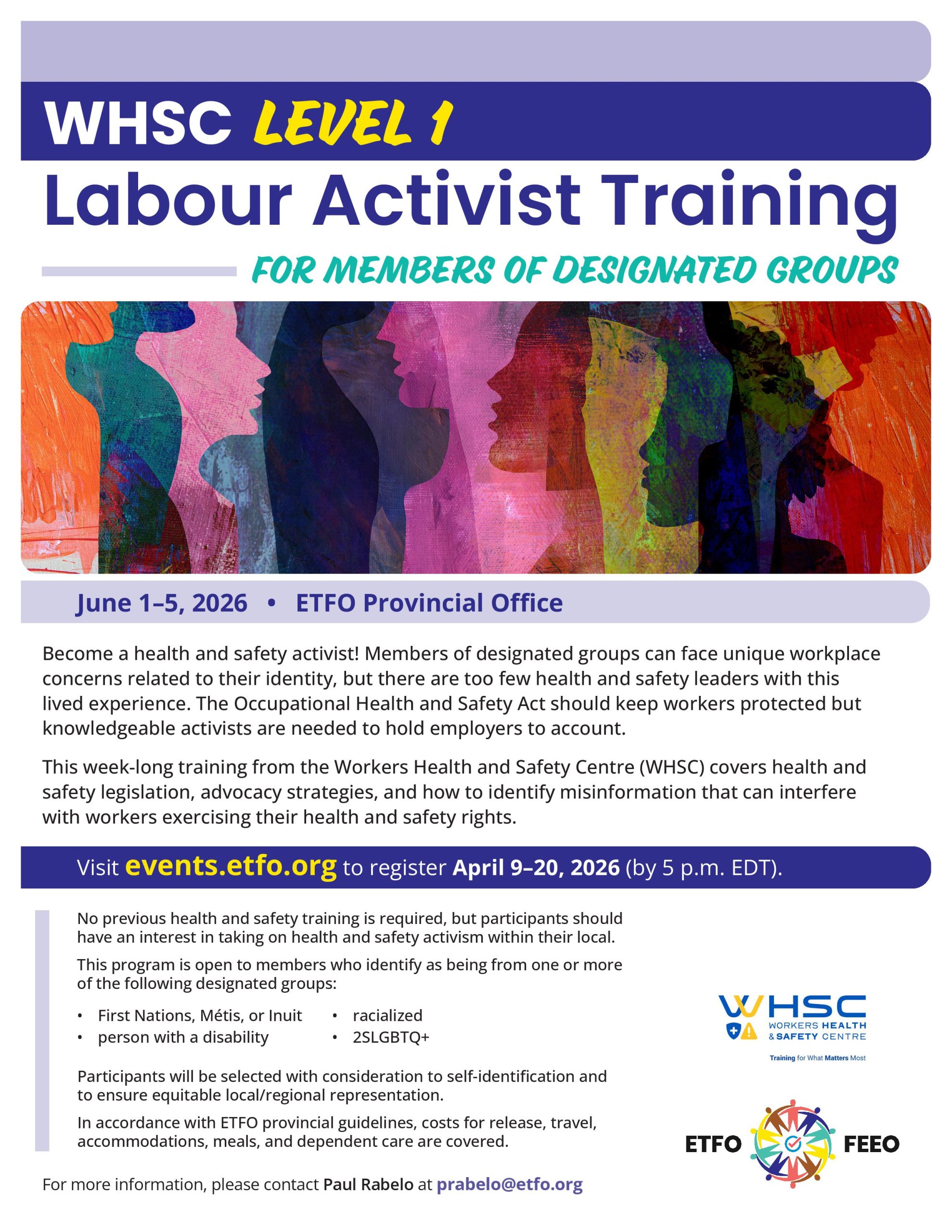 ETFO Provincial Office 136 Isabella Street, Toronto, ON, CanadaMembers of designated groups can face unique hazards in the workplace and are needed to become health and safety activists. Learn to recognize all hazards and how to improve health and safety protections at your board. Register between April 9 and 20.